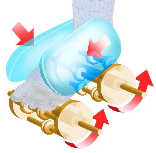 Sous le repose-jambes se cache un mécanisme ingénieux de galets massants. Ces galets exercent des pressions rotatives sur les zones réflexes de la voûte plantaire, stimulant l’organisme tout entier.